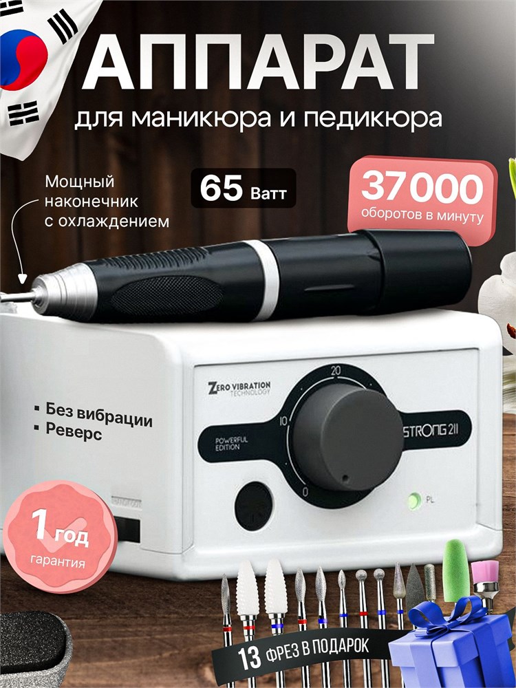 Профессиональный аппарат для маникюра и педикюра STRONG 211 MAX, модель H400RU, имеет мощность 64 Вт и скорость до 37000 оборотов в минуту. Продукция от Ardalit