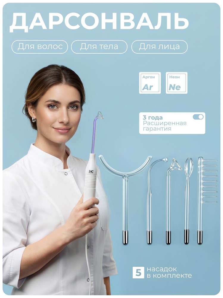 Профессиональный прибор HoneyCare от Дарсонваль с пятью насадками предназначен для ухода за волосами, лицом и телом