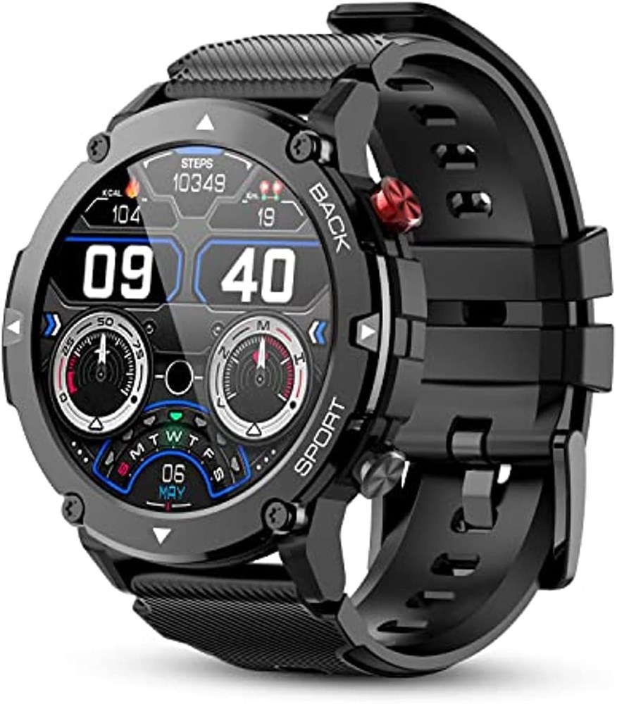Мужские умные часы DHNQKJ с Bluetooth-поддержкой (прием и совершение звонков), водонепроницаемые, IP68, 1,32-дюймовые, тактические, фитнес-трекер с пульсометром, умные часы для спорта на открытом воздухе (черные)