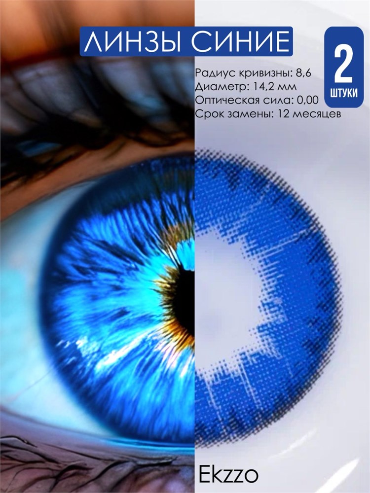 Kонтактные линзы Ekzzo в цвете, без диоптрий, с базовым радиусом 8.6, без цилиндра и оси, рекомендуемый срок замены - 12 месяцев.