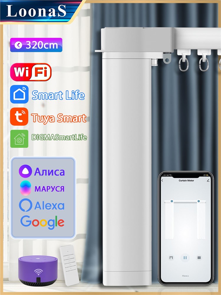 Умный мотор Loonas для штор с функцией управления голосом, доступом через приложение, пультом и подключением к Wi-Fi