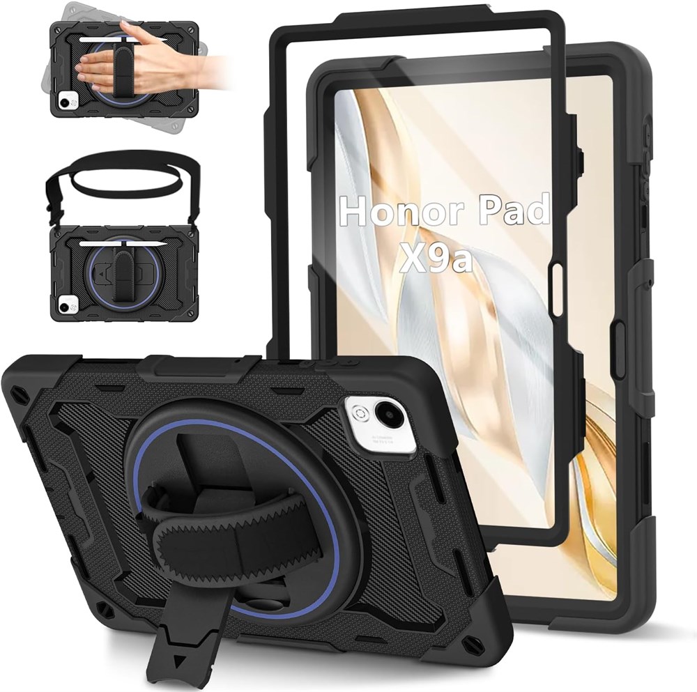 Чехол для планшета Honor Pad X9a 11,5 дюйма (2025) с защитой HD-экрана, ударопрочный, прочный, детский, с вращающейся на 360° подставкой/плечевым ремнем/держателем для ручки. Чехол для планшета Honor X9a 11,5 дюйма, черный