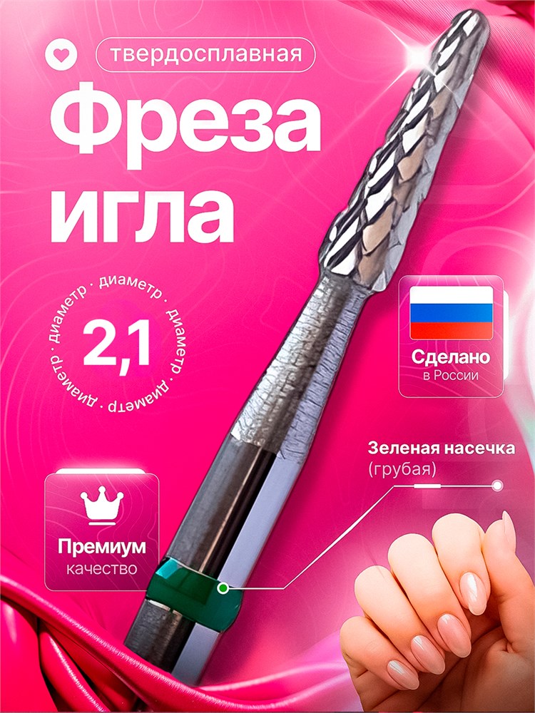 Фреза для маникюра и педикюра, изготовленная из твердого сплава, представляет собой иглу диаметром 2,1 мм. Цвет - зелёный. Код товара 100358