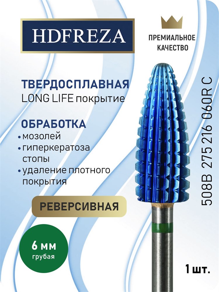 Фреза из твердого сплава HDFREZA предназначена для проведения маникюра, педикюра, удаления покрытия. Ее диаметр составляет 6.0 мм, поверхность режущей части грубая (зеленая насечка), имеет реверсивное исполнение и форму конуса (кукурузы). Код товара: 508B