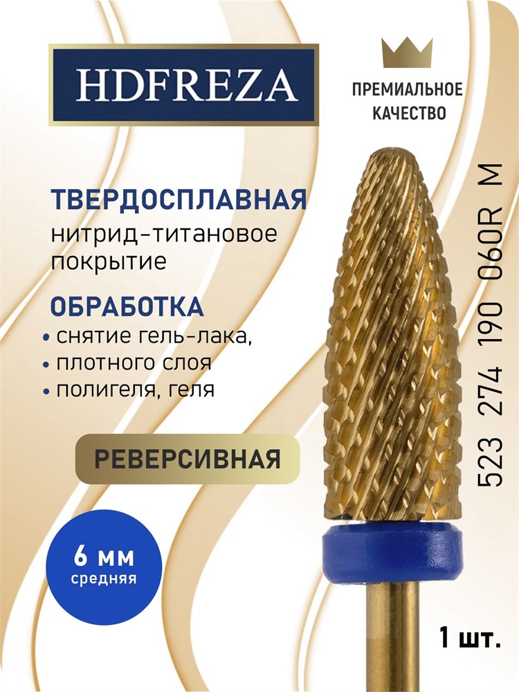 Фреза HDFREZA предназначена для выполнения маникюра, педикюра и удаления покрытия. Ее диаметр составляет 6,0 мм, она имеет среднюю зернистость (синюю насечку), реверсивное исполнение и коническую форму (кукуруза). Артикул данной фрезы: 523 274 190 060R M
