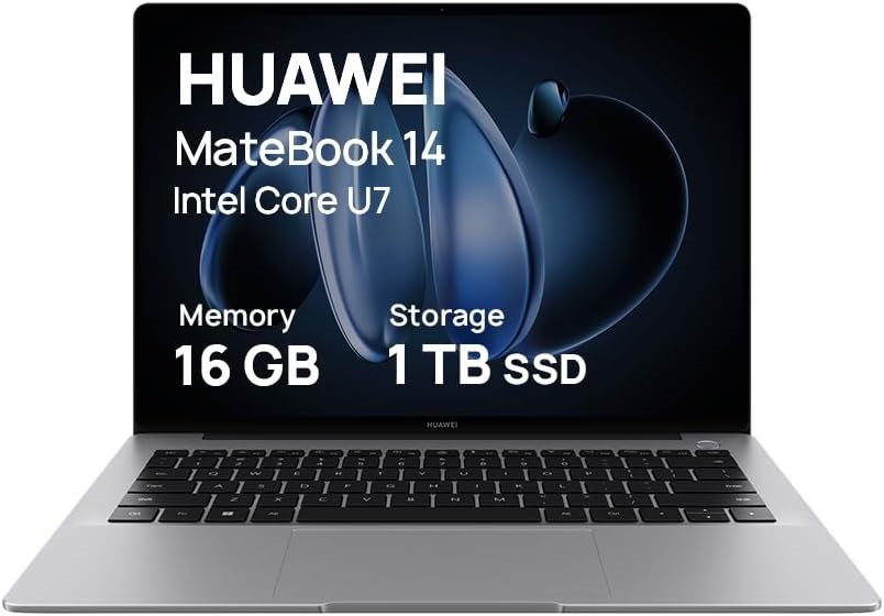 HUAWEI Matebook 14, 14,2-дюймовый OLED-дисплей с разрешением 2,8K, сенсорным управлением и возможностью ввода текста, ультратонкий дизайн, процессор Intel Core Ultra U7, 19 часов непрерывного воспроизведения видео, 16 ГБ + 1 ТБ памяти, Windows 11 Home, цв