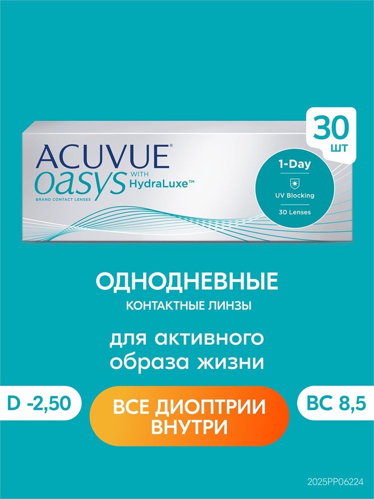30 штук однодневных контактных линз ACUVUE OASYS с диоптрией -2.50 и радиусом кривизны 8.5. Бесплатная доставка по всему Таджикистану.