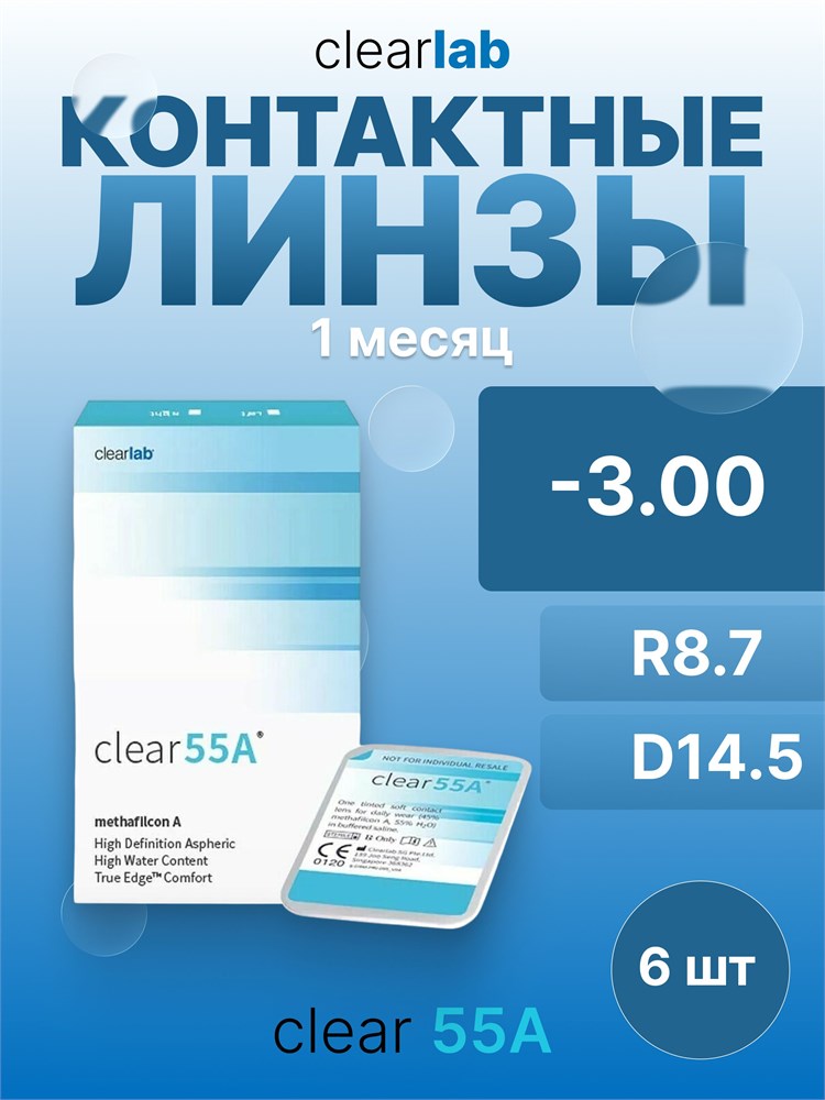 Clear 55A контактные линзы с силой -3,00, радиусом кривизны 8,7 мм, диаметром 14,5 мм, предназначены для использования в течение одного месяца и поставляются в упаковке по 6 штук.