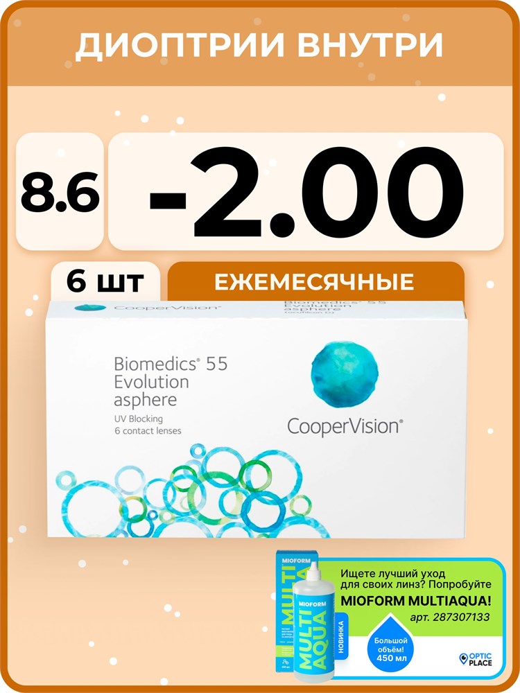 Контактные линзы CooperVision Biomedics 55 Evolution Asphere (6 штук) с диоптрией -2.00 и радиусом кривизны 8.6 мм - это ежемесячные прозрачные линзы.
