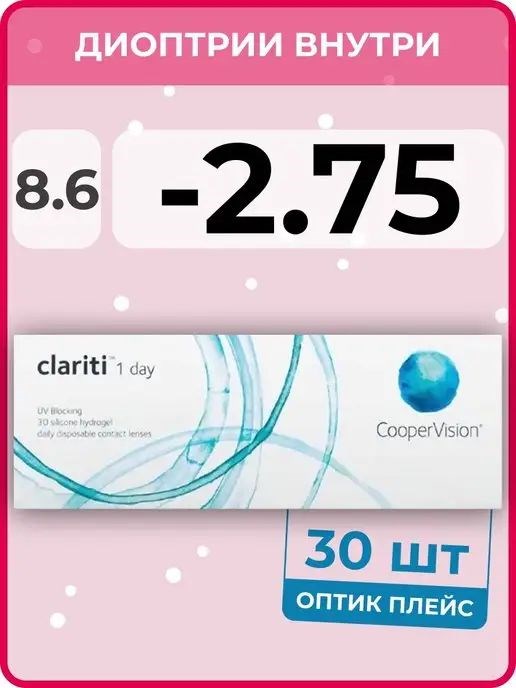Однодневные контактные линзы CooperVision clariti 1-day (30 штук) с показателем -2.75 R и базовой кривизной 8.6, имеют прозрачный цвет.