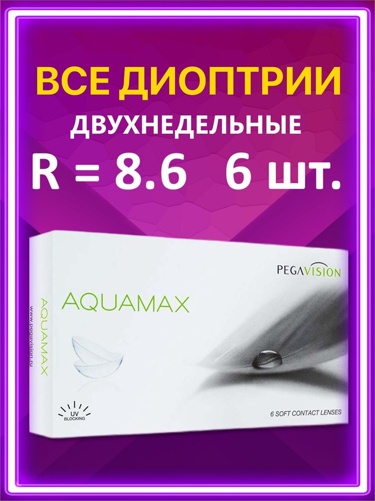 Шестерка двухнедельных контактных линз Aquamax Pegavision с диаметром 8.6 и силой -5.00 для глаз составляет 6 штук. Бесплатная доставка по всему Таджикистану.