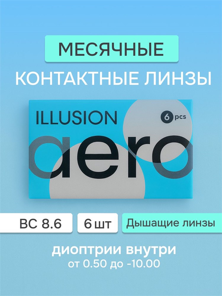 Линзы контактные ILLUSION AERO с параметрами 8.6, -3.00, диаметром 14.2 мм, упаковка на 6 штук, предназначены для ежемесячной замены, имеют прозрачную структуру.