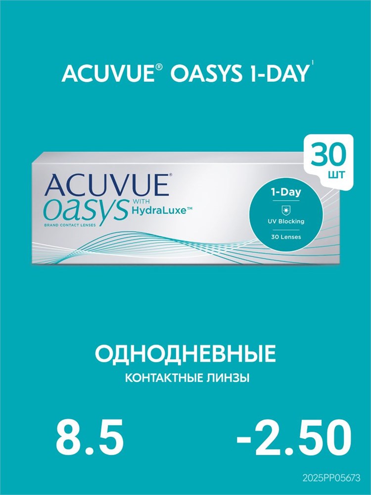 30 штук однодневных контактных линз Acuvue 1-Day Oasys с технологией Hydraluxe, радиус кривизны 8.5 и диоптриями -2.50. Бесплатная доставка по всему Таджикистану.