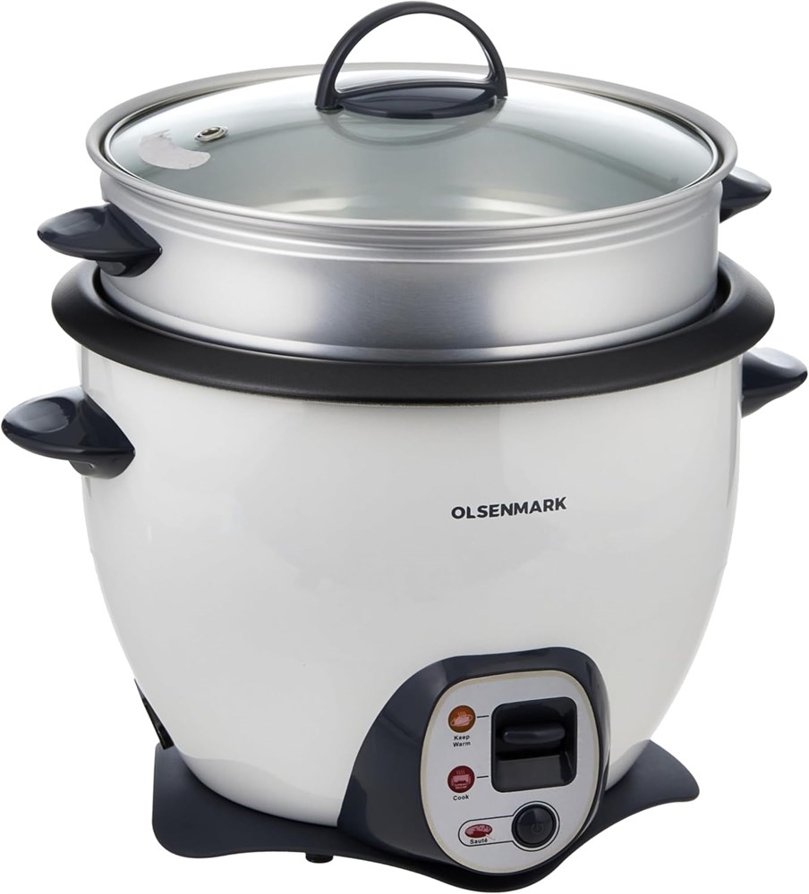 Данный товар доставим по всему Таджикистану: Автоматическая рисоварка Olsenmark мощностью 650 Вт, объем 1,8 литра, бело-зелено-черная.