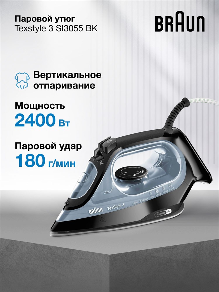 Паровой утюг Braun Texstyle 3 SI3055BK имеет мощность 2400 Вт и паровой удар в 180 г/мин. Он оснащен турбо режимом, функцией вертикального отпаривания и автоотключением