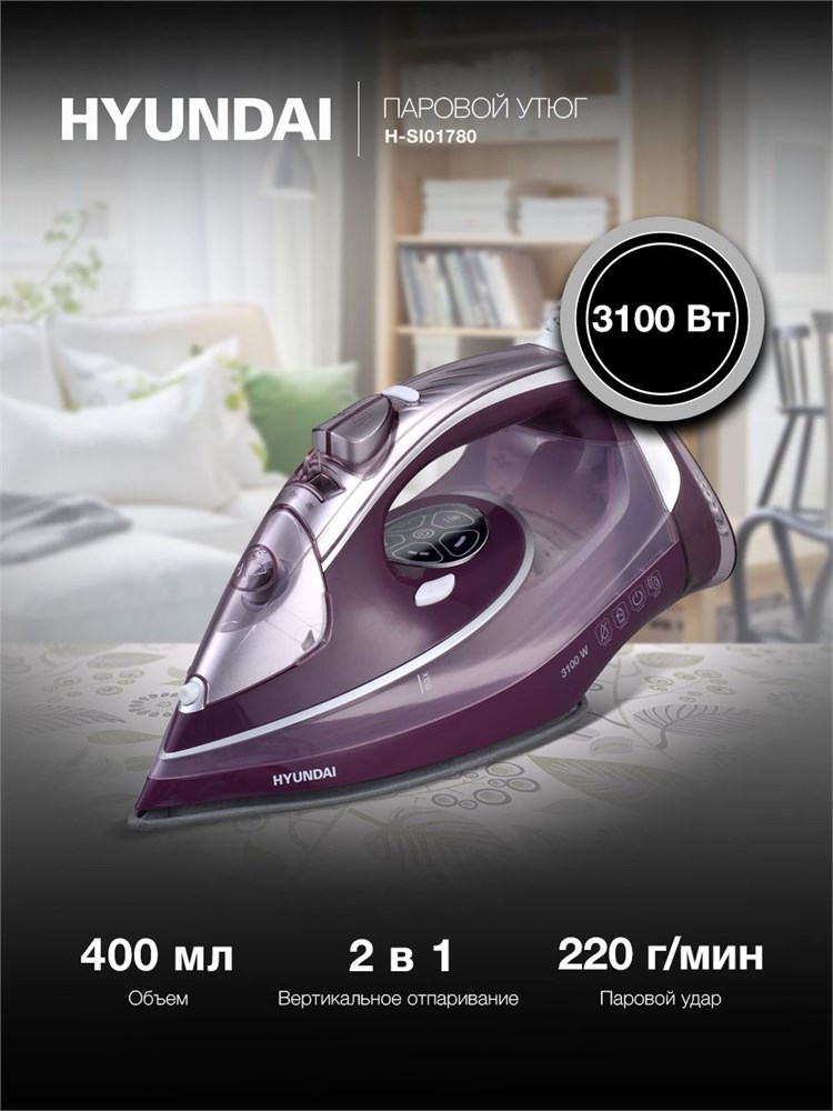 Утюг Hyundai H-SI01780 с функцией вертикального отпаривания имеет мощность 3100 Вт, паровой удар составляет 220 г/мин, автоматическое отключение, а также функцию самоочистки