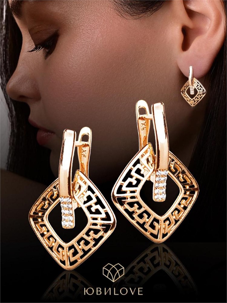 У Xuping Jewelry Co. есть женские серьги, покрытые золотом, украшенные искусственными камнями и имеющие длинную форму.