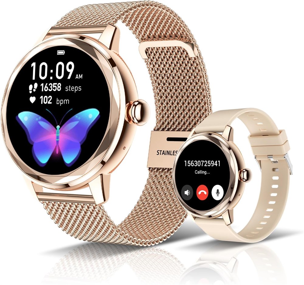 Умные часы для женщин с функцией вызова/звонка, золотые женские часы с дисплеем 1,19 дюйма для телефонов Android и iOS, с защитой IP67, фитнес-трекером, монитором артериального давления, пульса, сна и женского цикла, 2 ремешка