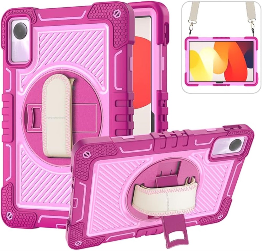 Чехол для планшета Xiaomi Redmi Pad SE 11 дюймов (2023). Прочный, трёхслойный, ударопрочный, с вращающейся на 360 градусов подставкой и ремнём для руки и плеча, розовый. доставляем курьером по городам и районам Таджикистана.