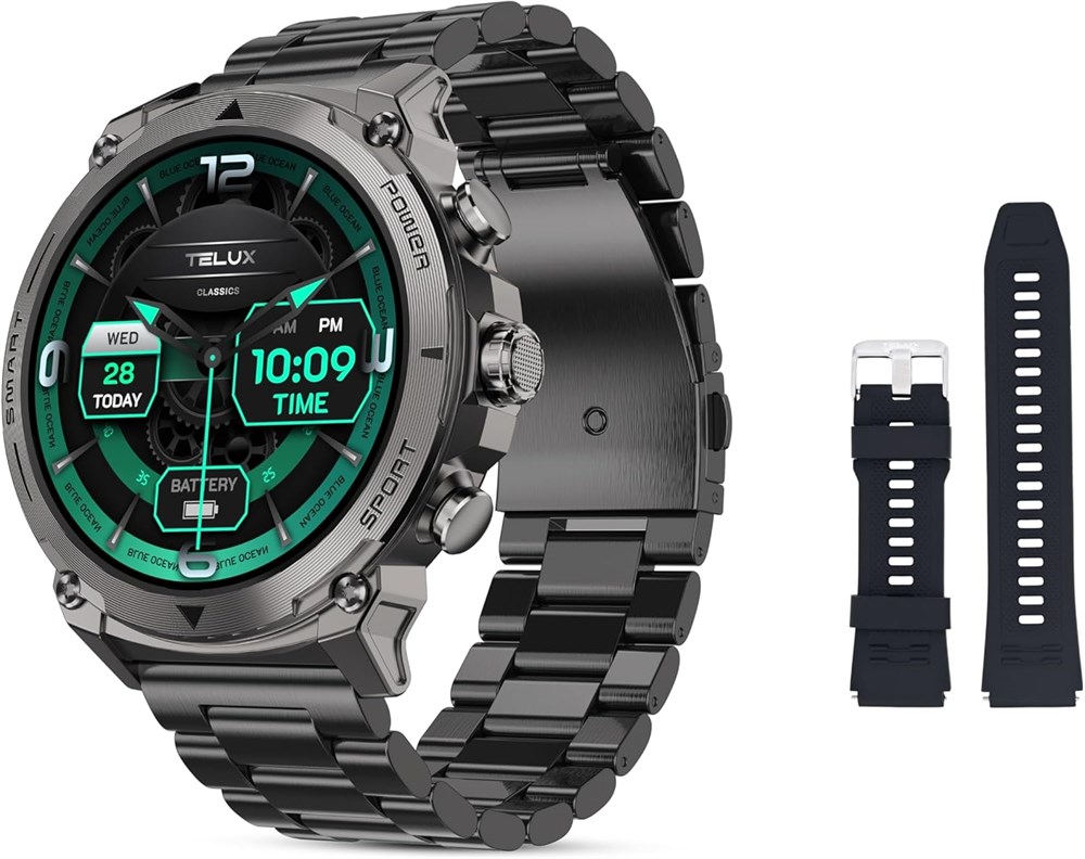 Умные часы TELUX ACTIVEX с функцией звонков, дисплей AMOLED 1,43 дюйма, 2 ремешка (нержавеющая сталь и силикон), голосовой помощник на базе искусственного интеллекта, отслеживание сна, более 100 режимов, водонепроницаемость IP67, аккумулятор на 10 дней, п