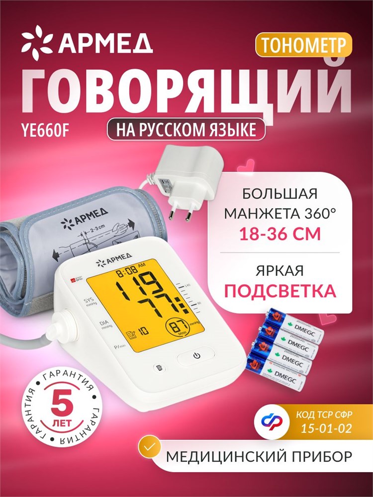 Армед YE660F - это автоматический тонометр, который надевается на плечо для измерения давления. Устройство оснащено подсветкой и голосовым сопровождением. Манжета обеспечивает полный охват плеча и подходит для обхвата от 18 до 36 см. Устройство имеет сертификат ФСС 15-01-02. Доставка этого товара осуществляем по всему Таджикистану.