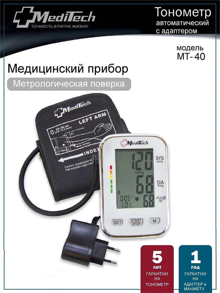 Автоматический тонометр MediTech МТ-40 с двумя блоками памяти, манжетой на 22-36 см и адаптером.