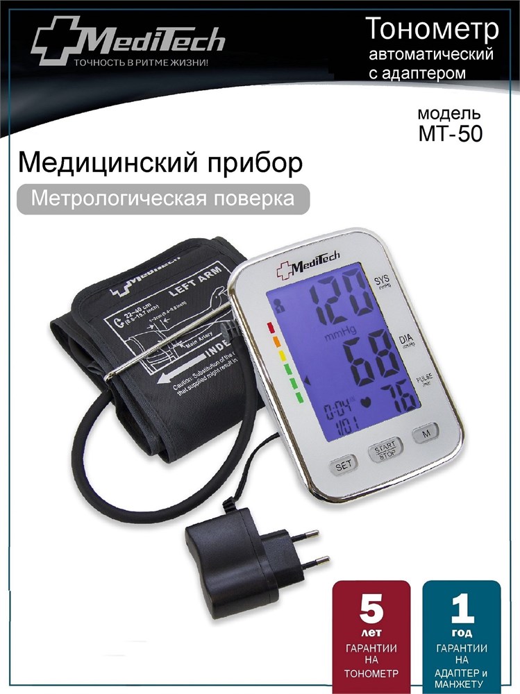 Автоматический тонометр MediTech МТ-50 с двумя блоками памяти, подсветкой экрана, манжетой размером от 22 до 40 см и в комплекте с адаптером.
