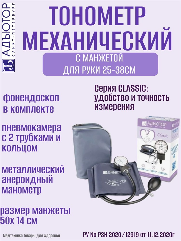 Механический тонометр ИАД-01-1 с комплектом 1 включает в себя манжету размером от 25 до 38 см. Адъютор.