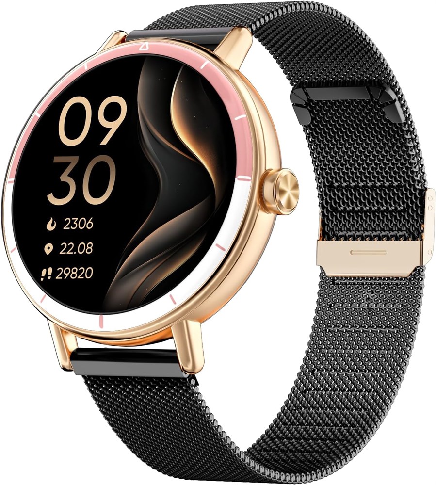 Умные часы TOOBUR для женщин с сетчатым металлическим ремешком, совместимы с телефонами Android и iOS, шагомер, ежедневный трекер активности, монитор женского здоровья, функция ответа на звонки, черно-золотой цвет с доставкой по всему Таджикистану.