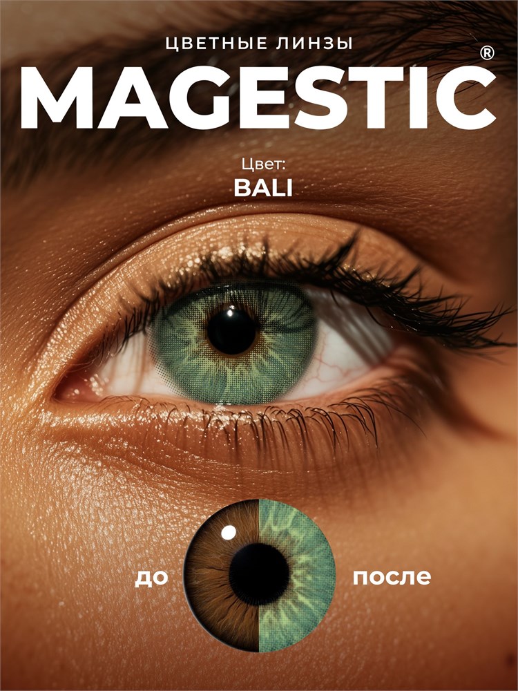 Контактные линзы MAGESTIC BALI, зеленого цвета, предназначены для глаз. В упаковке одна пара линз, срок использования - 12 месяцев. Диоптрии отсутствуют. Бесплатная доставка по всему Таджикистану.
