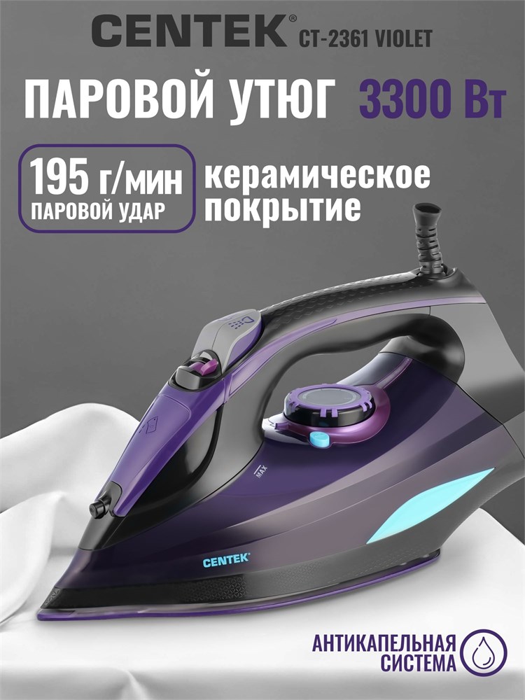 У нас есть утюг Centek CT-2361 VIOLET с мощностью 3300 Вт и керамической подошвой. Он имеет сильный паровой удар, функцию самоочистки и гарантию на 1 год. Товар уцененный