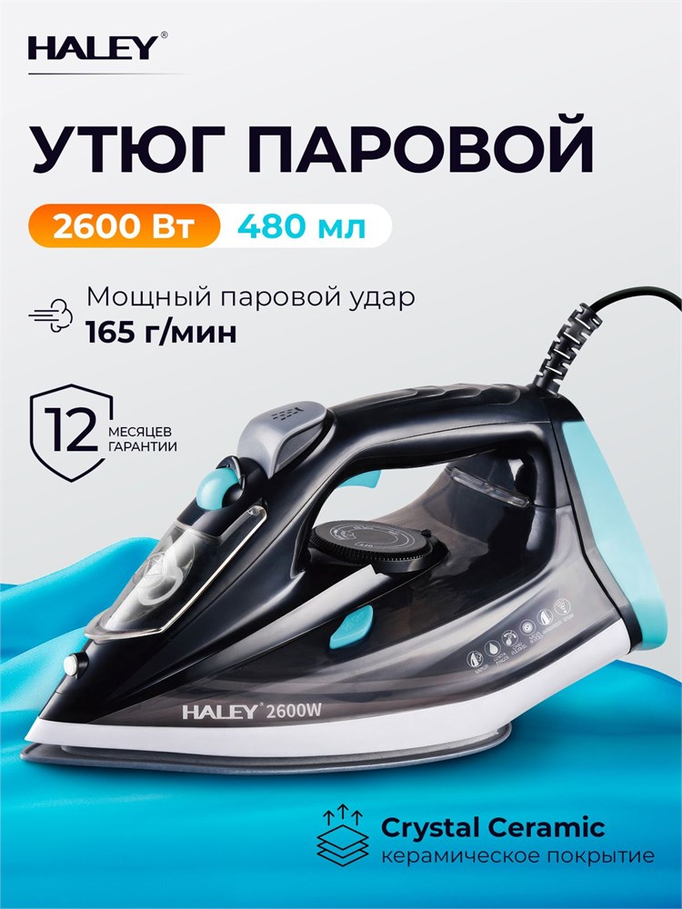 Утюг HY-2048 имеет мощность 2600 Вт и объем резервуара для воды 320 мл, он черно-голубого цвета