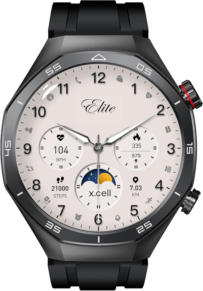 Умные часы Xcell Elite7, HD-дисплей 1,52 дюйма, Bluetooth-звонки, беспроводная зарядка, пульсометр/АД/SpO2, многоязычный, IP67, аккумулятор на 7 дней, совместимый с iOS/Android корпус с черным силиконовым ремешком